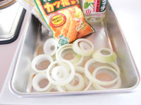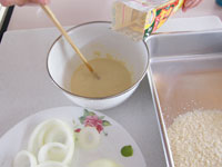 3.小さめのボウルに昭和の「カツ揚げ粉」をいれます。水で溶きトロンとした状態にします。そして玉ねぎをくぐらせ、次にパン粉をつけます。