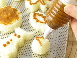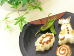 MEMO クッキーカッターでおにぎりを作る場合はなるべく単純な形のものを選びましょう。またお味噌はバターナイフで塗るとやり易いです。醤油は刷毛で薄っすら塗りましょう。また付け合せのしし唐も天板の隅っこにのせて焼いてしまいましょう。お野菜の素焼きにももってこいの「ドーナツ天板」です。