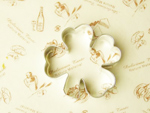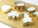 2.お好みのクッキーカッターの内側を濡らしておきます。まな板にラップを敷きクッキーカッターを並べます。温めたご飯をギューと型に押し込んでいきます。フカフカだと形がきれいに出にくいので、ちょっとだけ押す感じでご飯を詰めましょう。厚さ1.5センチくらいになるまでご飯を詰めます。いい感じに詰めたらご飯を押さえながらクッキーカッターを外します。