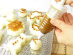 3.ショートニングを塗った「ドーナツ天板」にクッキーカッターから外したおにぎりを並べましょう。そして200度のオーブンで7〜8分焼いたら取り出してお味噌とお醤油を塗り、さらに1分30秒〜2分焼きます。ちょっと焦げ目が付くくらいがベストです。そんな状態になったらオーブンから出して熱々のうちにお召し上がりください。
