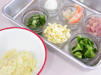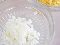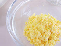 5.ゆで卵は半分は具として使い、残りの半分は卵黄と卵白に分け、みじん切りにします。このみじん切りにした分はトッピング用です。