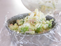 9.ハンバーガー・バンズ型にラップを敷きこみ、出来上がったポテトサラダを詰めます。高さは1センチくらいが良いです。