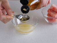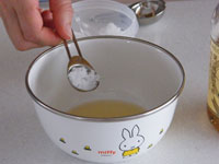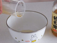 2.合わせ酢を作っておきます。砂糖より塩の方が溶けにくいので、ぐるぐるかき混ぜて、しっかりと酢に溶かしておきましょう。