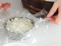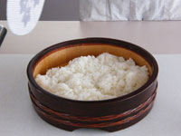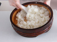 3.次に酢飯を作ります。飯台は内側を十分に水で濡らし、乾いた布巾でふいておきます。炊いたご飯を飯台に移し、合わせ酢をしゃもじで受けながら回し入れます。ご飯を練らないように、合わせ酢を均一に混ぜていきましょう。なるべく時間をかけずに冷ましたので、うちわでしっかり扇ぎご飯を冷ましましょう。だいたい冷めたら、表面が乾燥しないよう、固く絞った布巾を広げてかぶせておきます。