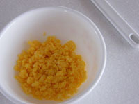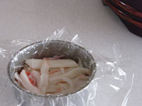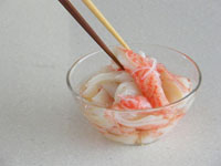 4.具の準備をします。カニかまは粗くほぐし、砂糖大匙1+酢大匙3+塩ひとつまみを溶かした液に漬けておきます。