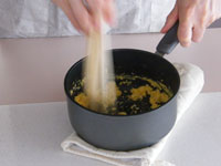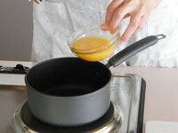 5.卵は炒り卵にします。卵を溶きほぐし、砂糖と塩で味付けします(砂糖小匙1・塩ほんのひとつまみ)片手鍋を中火にかけ、熱くなったら卵を一気に入れ、菜ばしを6本握って卵をぐるぐるかき混ぜます。およそ10秒たったら火からおろし、予熱で一気に仕上げます。休むことなくぐるぐるかき混ぜましょう。キメの細かいきれいな炒り卵の完成です。スクランブルエッグとは異なります。フライパンで作る感じではありません。油を引かず仕上げることで細かい炒り卵になります。フッ素加工の片手鍋で作ると後片付けも簡単でしかもきれいにできます。