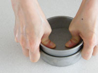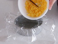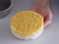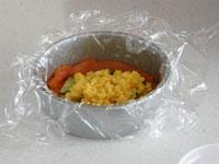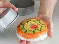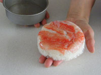 6.具の準備ができたら押し寿司を作っていきましょう。「ハンバーガー用パン型」に隅っこまできっちりとラップを敷きます。具を置きます。そして全体量の5分の1の酢飯をのせます。ご飯を平にならし、周囲のラップで包み込むように、空気を入れないよう蓋します。もうひとつの「ハンバーガー用パン型」を上にのせ、ギューと押します。このときしっかりと押してください。これでOKです。