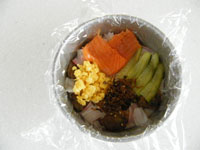 ◇具として◇ スモークサーモン 3〜4枚 卵 Sサイズ2個 カニかま 4〜5本 ぬか漬けのきゅうり 3分の1本 あさりの時雨煮(缶詰のもの) 小さめ1缶 ふりかけ 適量 シソの葉 3〜4枚 きざみ海苔 少量 生姜 一片 |