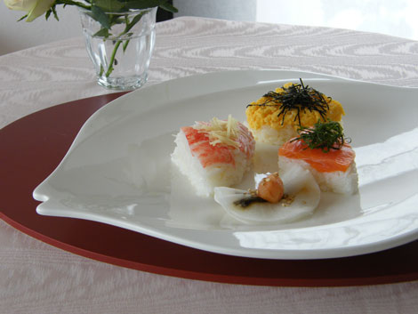 8.ねかした押し寿司をまな板の上でひとくちサイズにカットするも良し!そのままお皿に移し、丸い押し寿司をいただくも良し!