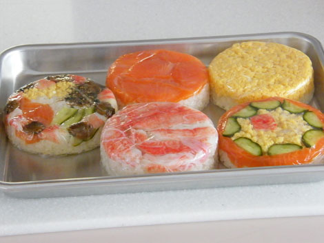 7.型から取り出し、ラップにくるんだままバットに並べます。これを繰り返して5個の押し寿司を作ります。バットに並べ冷蔵庫で30〜40分冷やします。