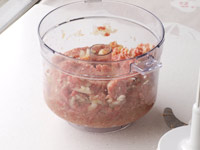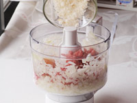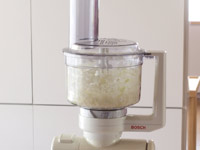 1.今回は「BOSCH マルチブレンダー」でダダーッと具をチョップして準備します。まず「マルチブレンダー」のワークボウルに刃をセットし、ぶつ切りにした玉ねぎを入れます。蓋をしてマシーンに取り付けダダーッとチョップします。高速でなく、低速でみじん切りにします。高速でカットすると玉ねぎから余分な水分が出てしまうので、ここは高速でやらず、低速の「1」「2」がお勧めです。(余談になりますが、フードプロセッサーで玉ねぎのみじん切りを作ると水っぽくなりがちです。その原因としてスピード調整がきかないフードプロセッサーはどんな食材も高速で一気にチョップします。いままで、それが当然と思い、水っぽい玉ねぎで我慢していました。ところが、BOSCH マルチブレンダーを使ってみると、スピード調整ができるんです。そこで低速とストップを繰り返しながら玉ねぎのみじん切りをやってみると、これが不思議!玉ねぎが水っぽくないんです。それ以来、まな板の上で広がってしまう玉ねぎのみじ切りはBOSCH マルチブレンダーにお任せしてます)では先に進みます。