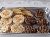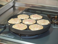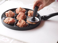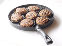 ●ぺったん!ぺったん!ひき肉を手のひらで整え焼いていたハンバーグ!!ところがどっこい!素晴らしいフライパンを発見!このフライパンならハンバーグの種をスプーンですくってパコっとのせ、付属のプレスで押して形を整えるだけ!しかも一度に7個のハンバーグが焼けちゃうなんて!出来すぎのフライパンです。その名は【 バーガービッツグリル&プレス 】と申します。それでは新鮮な牛ひき肉を250グラム用意してジューシーなハンバーグを作りましょう。家族全員のハンバーグが一度に焼けちゃうから、誰一人待たせず、揃って「いただきまーす!」が言えます。