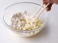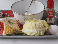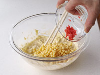 4.ボウルに薄力粉、コーンスターチ、塩、胡椒、「1」のキャベツ「2」の紅しょうがを入れます。そこへ卵を割りほぐし水を加えながら全体をかき混ぜます。(長芋のすりおろしを加えるとふわふわになります。ご用意があれば入れてください)そして最後に天かすを混ぜます。