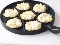 8.こんがり焼けた「おやつ焼き」をプレートに取り、マヨネーズとソース、カツオ節をのせていただきます。