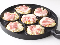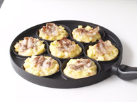 5.「ノルディックウェア バーガービッツ グリル&プレス」を火にかけ、薄く油を塗ります。「4」の生地をすくい入れます。その上に「3」の豚のバラ薄切り肉をのせます。
