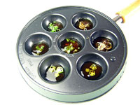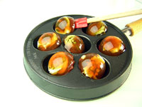 ●暑い夏にピッタリの冷たいオードブルをデンマークパンの可愛い丸の形にして冷やし固めます。デンマークパンのまんまるのドーム型がこんなにいっぱい並んでいる型って以外とないのです。ガス台にのせて使うばかりではありません。寒天を使った素麺と茶そばのオードブルはどうぞスプーンでいただいてください。寒天で固めますので常温では溶けずスパチュラでツルっと丸い型からはずせます。ちょっと取っ手の部分が冷蔵庫で邪魔になりますが、こんな可愛いぷるぷるオードブルが出来上がってしまうのならひんやり固まるまでの数十分だけ、デンマークパンにスペースを分けてあげてください。