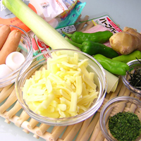 ウインナー・オクラ・ベーコン・マシュマロ・生姜・長ネギ・たくわん・長いも・青のり・もみのり・うずらの卵・スナック菓子のベビースターラーメンのうち用意できるものを準備します。