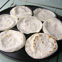 2.餃子の皮の両面にオリーブオイルを薄く塗ります。パンケーキパンをごく弱火にかけ温め、温まったらオイルを塗った餃子の皮をまず片面焼きます。片面がうっすらと焼けたらここでパンケーキパンごと火からおろします。(注:こんがり焼きたいところですが、ひっくり返してもう一度焼きますので、うっすら焼ければ大丈夫。)