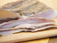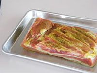 ●燻製と聞いて一番最初に思いつくのは・・・やっぱり「ベーコン」新鮮な豚ばら肉の塊を買ってきて下準備から始めましょう。下味をつける作業に数日かかりますので、せかっく作るのだから1キロくらいのお肉を準備することをお奨めいたします。