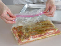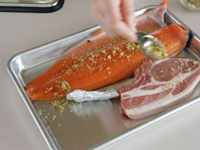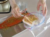 ◇準備するのは、サーモンと骨付きポークです。塩とお好みの香辛料をふりよく馴染ませます。 ◇表面にしっかりとふります。下準備の塩と香辛料は多めですが、これで大丈夫!! ◇厚手にビニール袋(ジップロックがお奨め)に入れます。 ◇食材ごとにビニール袋を分けて入れます。 ◇この状態で4日間、冷蔵庫でねかせます。一日一回ビニール袋の上から全体を馴染ませるよう軽く揉んでください。 |