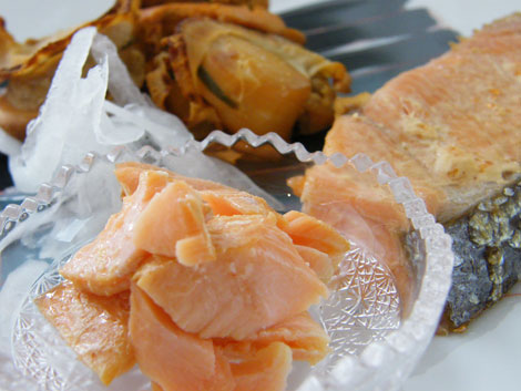 | | ◇ドライでスモーク塩シャケとスモークホタテ◇ ●こんなお手軽な食材までスモークしちゃいました!!甘塩鮭の切り身一切れと塩だれの焼き肉のたれに漬けたホタテ。75度のドライで1時間スモークしただけなのに、どうして燻製の香りをまとうとこんなに美味しくなってしまうのでしょう。 |