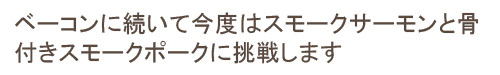 | ●ベーコンに続いて今度はスモークサーモンと骨付きスモークポークに挑戦します。穴あきのグリルラックは大きなサイズですので、一度に違う食材をスモークしてしまいましょう。 |