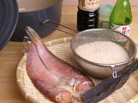 甘鯛のひらきは、両面焼いておく。炊き上がる5分ぐらい前に、一度鍋を取り出し、焼いた甘鯛をご飯の上にのせ、再びふたをしてオーブンへ。炊き上がりを待つ。