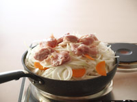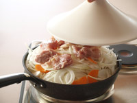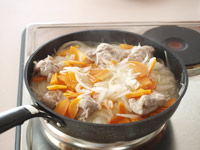 4.フライパンに少量のサラダオイルを回し入れます。そこへスライスした玉ねぎ全部とその上にニンジンと鶏肉をのせます。タジン蓋をして中火と弱火の間くらいで50〜60分加熱します。