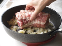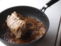 6、水分がなくなっているはずなので、ここで用意したスライスした玉ねぎをお肉の周囲にしきこみます