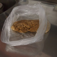 - 全体がいい感じに均一になったらかき混ぜは終了です。袋に生地をすべて入れます。手のひらで押しながらひとかたまりにします。このまま30分ねかします。