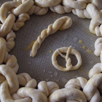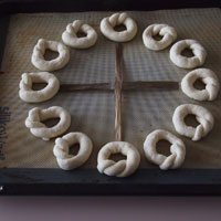 - 成型は生地を23センチに伸ばすだけなので簡単です。ポイントは生地を輪にしてバランスよく並べることです。輪の数は全部で24個です。