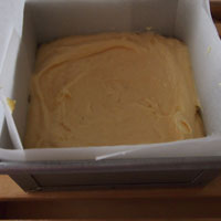 - 敷き紙を敷いた上にアーモンドスライス(あれば)を散りばめます。その上から「4」の生地を流し入れます。(底部分も香ばしいケーキなのです)