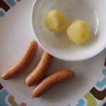 - ねかせた生地を打ち粉(強力粉)をした台の上に取り出し麺棒で厚さ1〜1.3センチくらいに伸ばします。ドーナツ型や丸い型抜きで抜きます。ウインナーを包むなら皮なしウインナーを準備すると良いです。皮つきのウインナーの場合は皮を剥きます。
