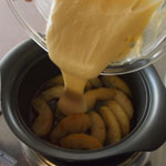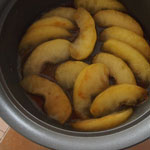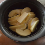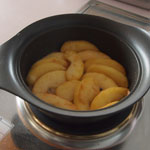 - 万能鍋の「D-Pot」に皮を剥きカットしたリンゴを並べます。その上に砂糖・バターをのせます。そして中火にかけます。