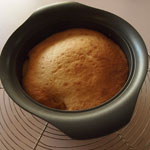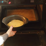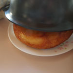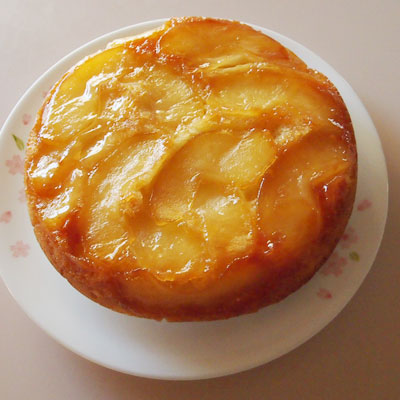 - 熱いうちにお皿をかぶせ、一気に逆さまにしてケーキを取り出します。これで完成です。熱いうちに取り分けバニラアイスをそえていただきます。