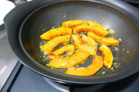 - 「panpotのD-pot」にサラダ油を引き、火にかけます。そこへかぼちゃを並べます。蓋をして片面3分ずつ弱火で加熱します。楊枝をさしてみてスーと通ったらOKです。