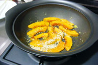 砂糖と塩ひとつまみをふり砂糖がとけるのを待ちます。この時は蓋はしません。徐々に白い砂糖が溶け始めます。砂糖は溶けて透明になったらかぼちゃの表面にからむよう鍋をあおりながらからませます。そして白ゴマをふり入れ完成です。