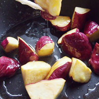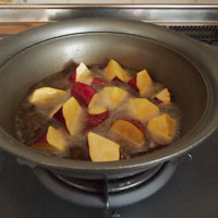 - サツマイモ「鳴門金時」は皮がついたまま、大きめの乱切りにします。