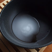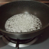 - 次に別の片手鍋に砂糖と水を入れ火にかけます。ふつふつと煮立たせ気泡が大きくなってきたら火を止め、揚げたサツマイモを一気に入れてよくからませてください。これで出来上がりです。