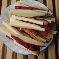 - サツマイモを洗い、皮のまま半分の長さに、そして縦に8ミリ角程度の棒状にします。