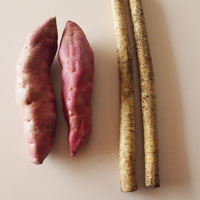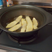 ●色がきれいなサツマイモ。今回は縦に長ーくスライスし、パリパリチップスを作ってみました。素材のみをオイルで揚げますので、衣がついた天ぷらとは違っておつまみ感覚でさっぱりといただけます。せっかくなのでゴボウのスライスも一緒に揚げてみました。おつまみチップスとしておすすめです。今回使用したサツマイモは「鳴門金時」です。サツマイモの中で最もアクが少なく、色よく揚がります。ピーラーで薄くスライスするのがちょっと難しいです。注意深くやってください。ぶきっちょさんは軍手をしてやるのが良いです。「鳴門金時」以外のサツマイモを使う場合は、いったん水に放しアクを取り、水気を拭き取ってから油に入れてください。アクを取り去ることできれいに仕上がります。