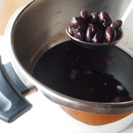4.5リットルの圧力鍋に「2」を入れ、深さの3分の1まで水を注ぎます。圧力鍋の蓋をして高圧で5分。圧力が下がるまでそのまま放置します。