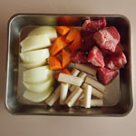 - 牛肉を鍋に入れ水3カップを注ぎ中火にかけ煮立てます。5分煮てザルにあげます。