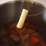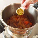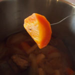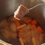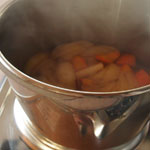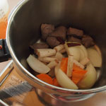 - 圧力鍋に「2」と野菜を入れ、「A」の出汁を注ぎ蓋を閉めます。高圧で12分。火を止め圧が下がるのを待ちます。